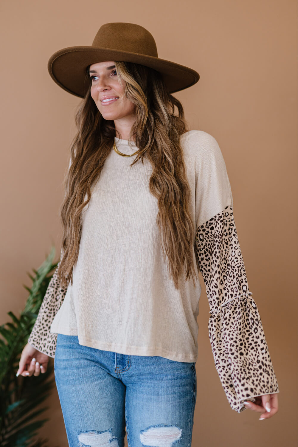 Fabulous and flirty, this oversized top has spliced knit and woven fabric that will dress up the comfort a tad. The knit body has a slight texture, and the leopard print woven ends in a fun flare.