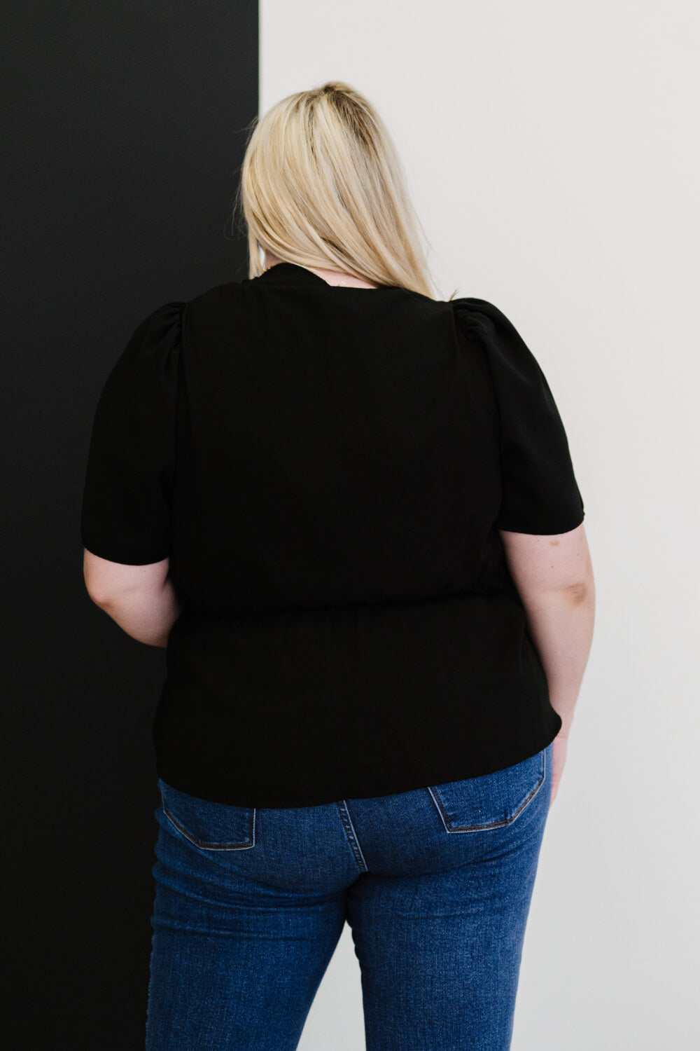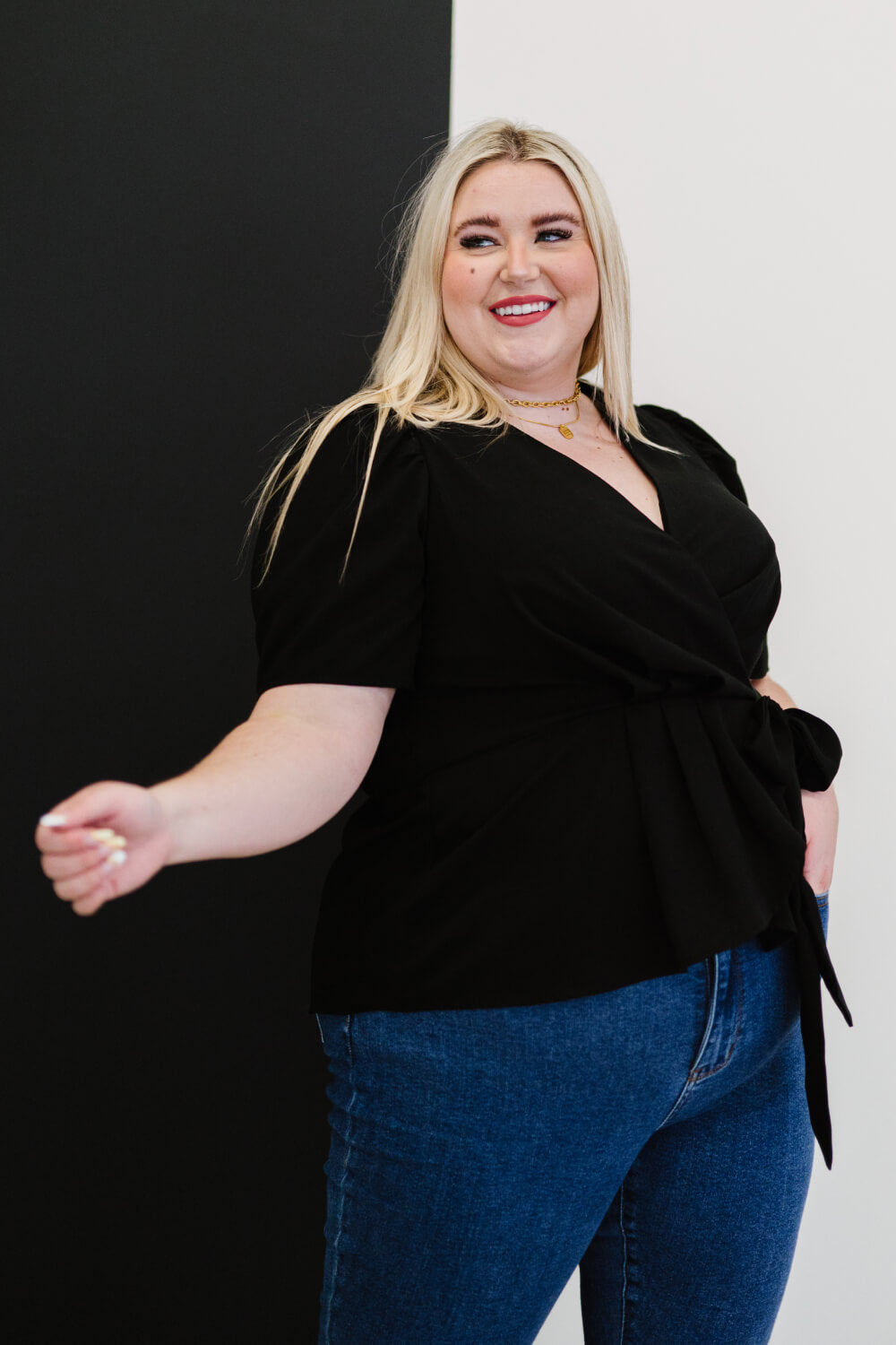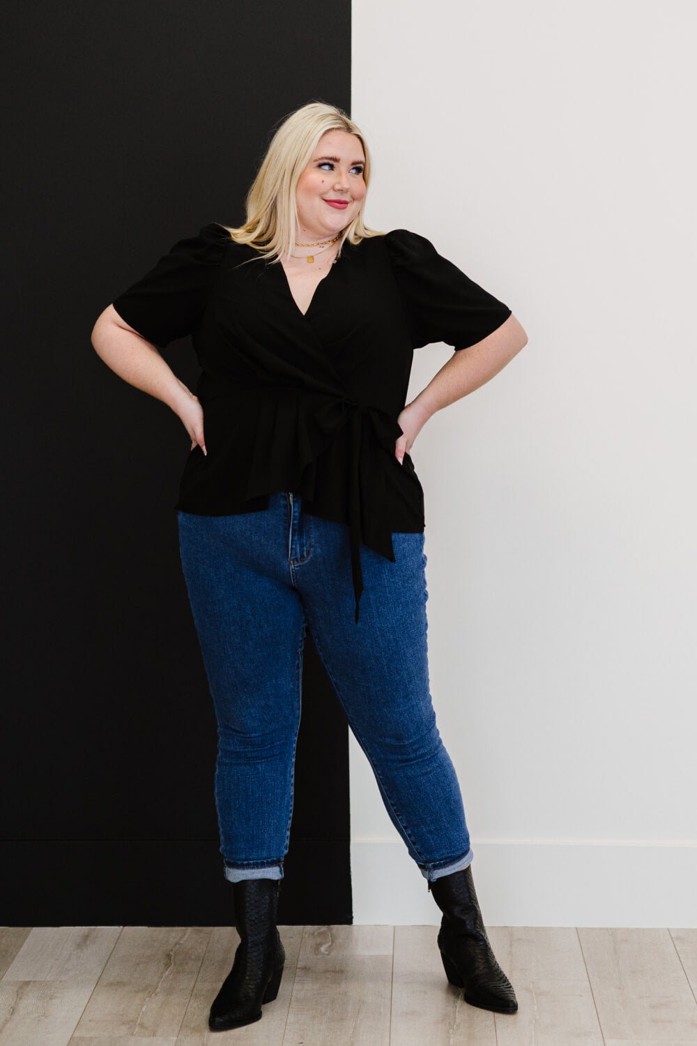 Our Understated Elegance Full Size Run Faux Wrap Blouse will keep you looking classy while you live your best life. The surplice neckline looks great. So do the half-length puffed sleeves. The top is lightweight with no stretch, but it does have a functional bow.