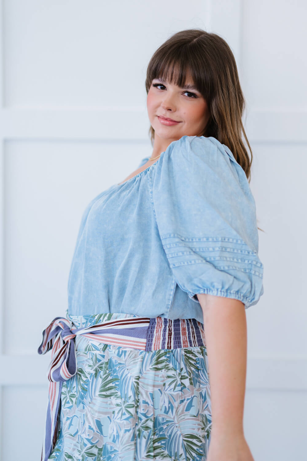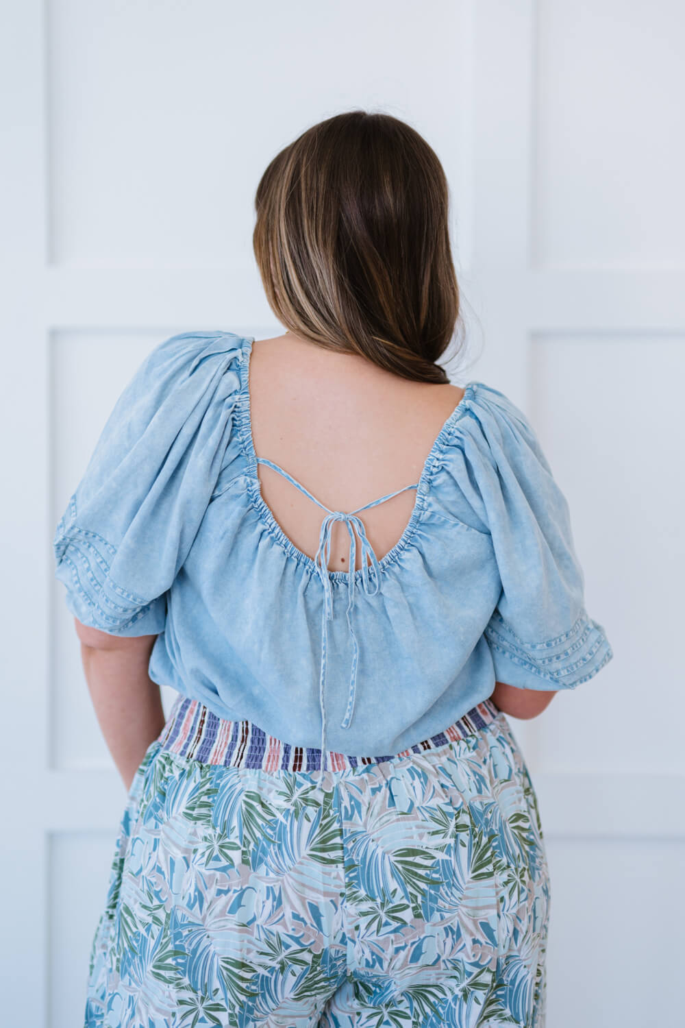 We are obsessed with this super soft chambray top! The light wash is so stylish, along with the puffed sleeves. With the elastic neckline, you can easily wear this top off the shoulder for an extra flair. The finishing touch is the cute tie in the back!