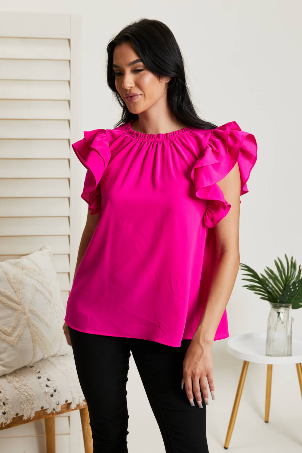 Oh how we love ruffles! This top features a frilly high neckline and layered flutter sleeves for an extra wow factor. Dress it down with a pair of jeans or dress it up with some slacks for work!
