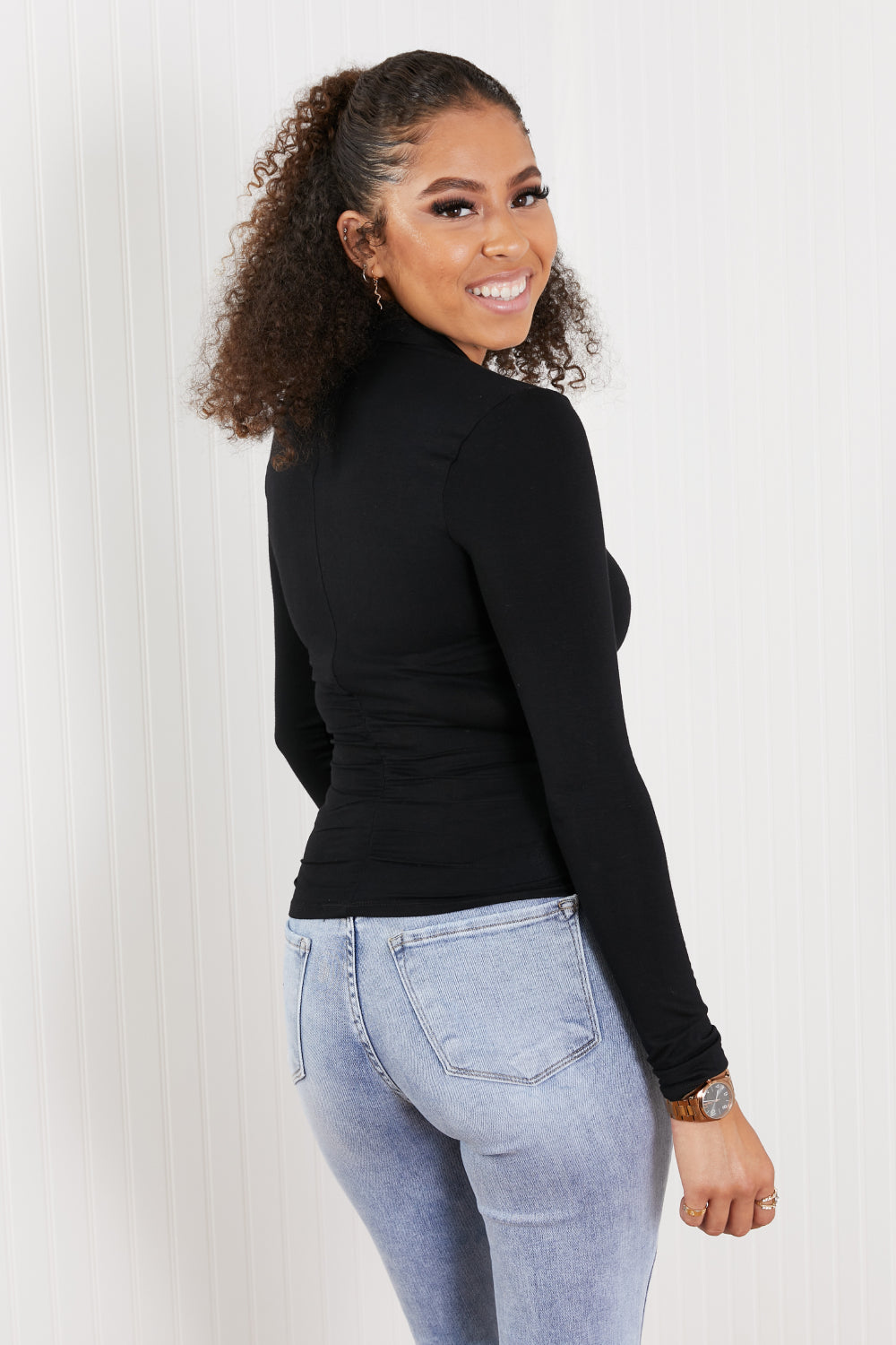 Ruching on this long-sleeve fitted top creates a figure-flattering shape that can be worn with so many things! Snaps down the front make for a fun and unique detail that is elevated with a collared neck.