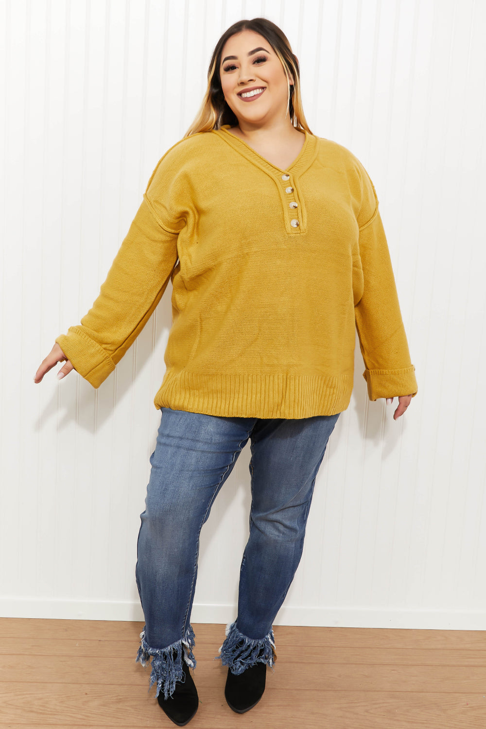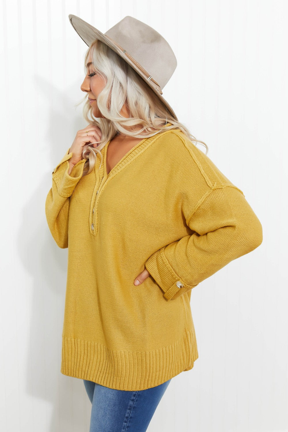 Here is a sweater with the cutest details to add a little interest to your outfit. It's a golden yellow color that will complement your skin beautifully, with a flattering v-neck that is outlined by ribbing along the neckline and a quarter-button front. The sweater features exposed seams and a decorative roll-tab on the cuff.