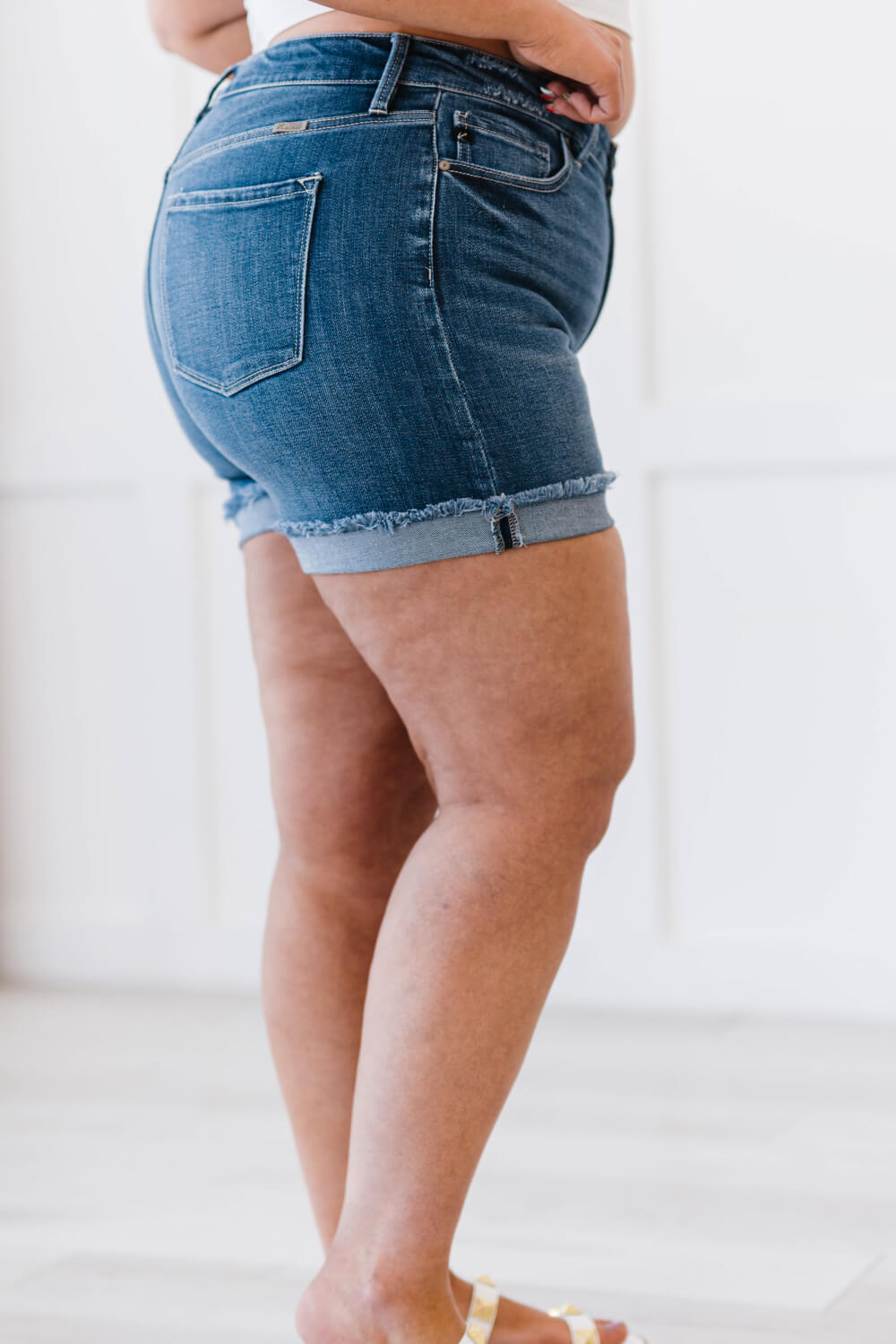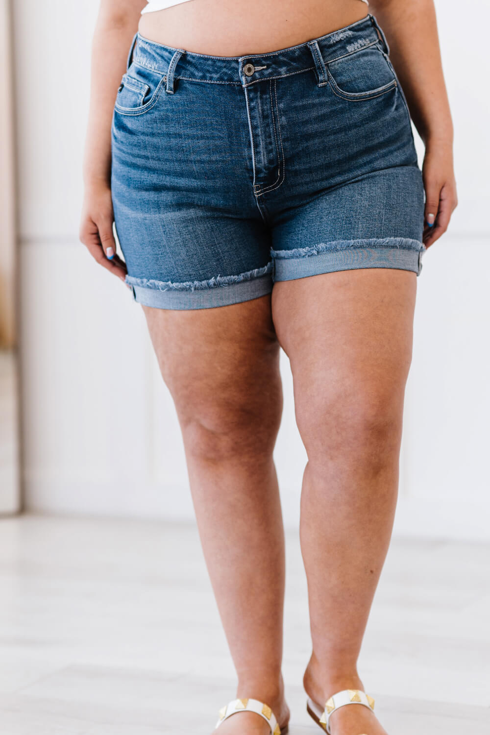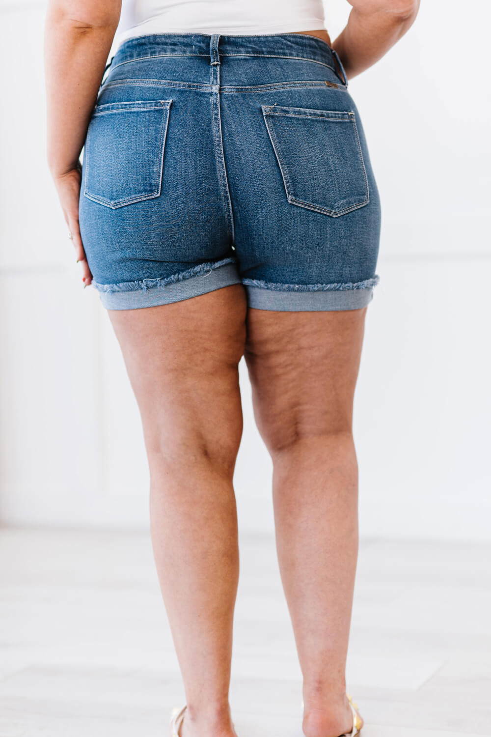 These fingertip length shorts have a high rise, slightly worn details, and a cute fold that goes with everything from a blazer to a graphic tee.