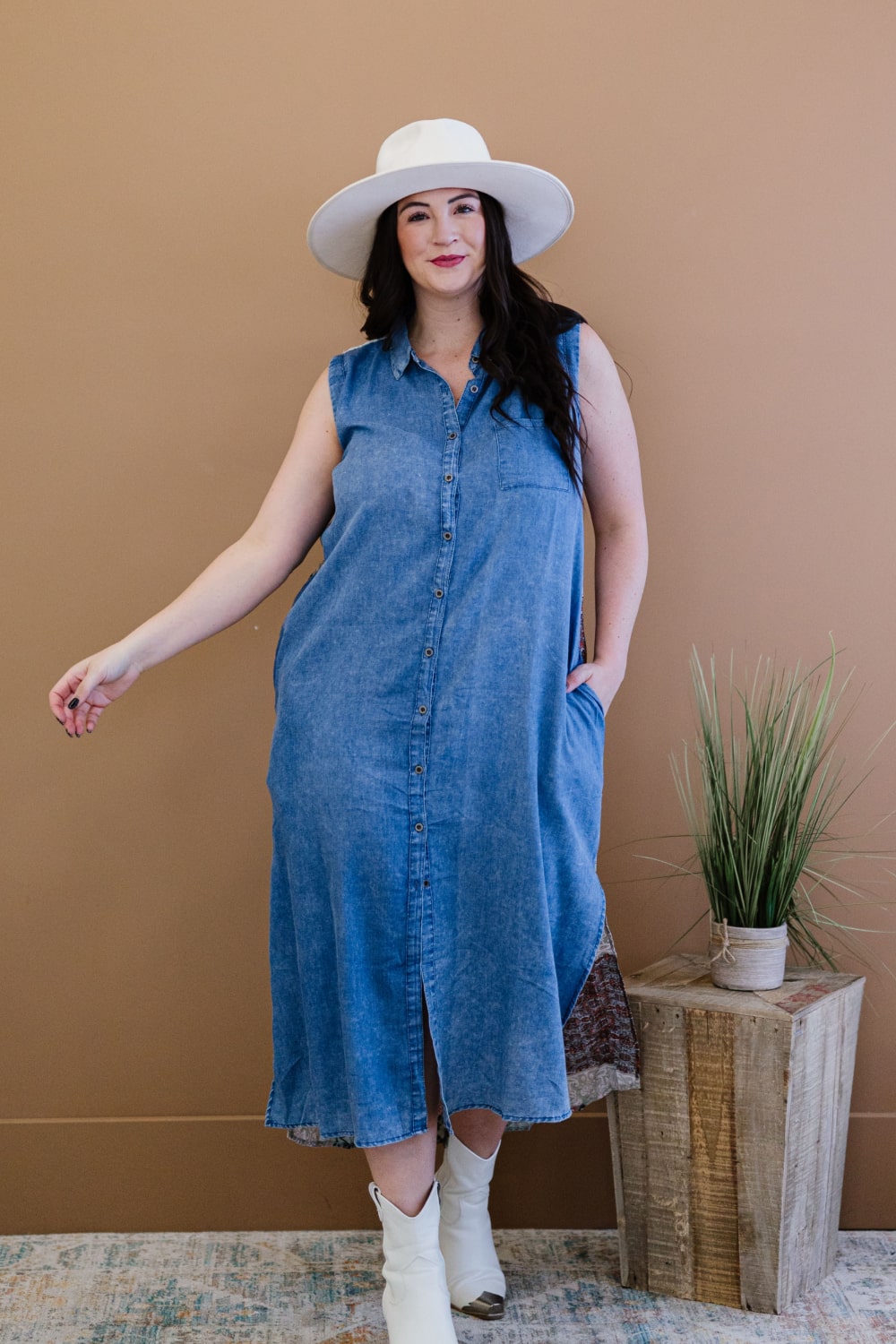How cool is this dress? The front is a light wash and lightweight chambray fabric that buttons up and has a collar. The back yoke is lace with a patchwork print covering the rest of the back. It hits at mid-calf with slits on both sides. It is sleeveless and has a breast pocket and side pockets! It would look great with a pair of sandals!
