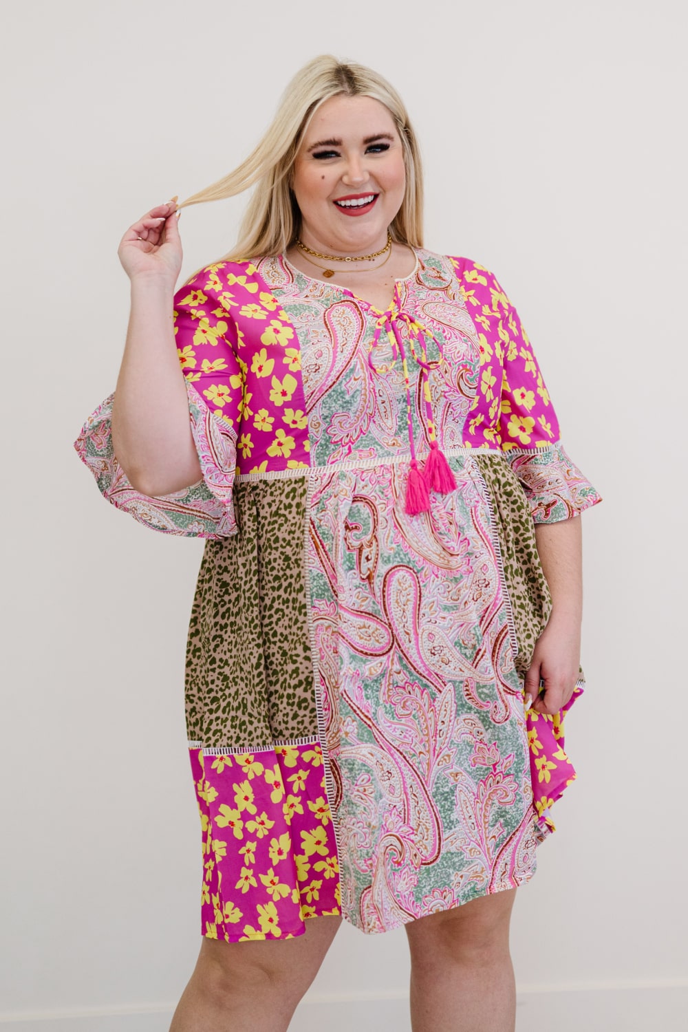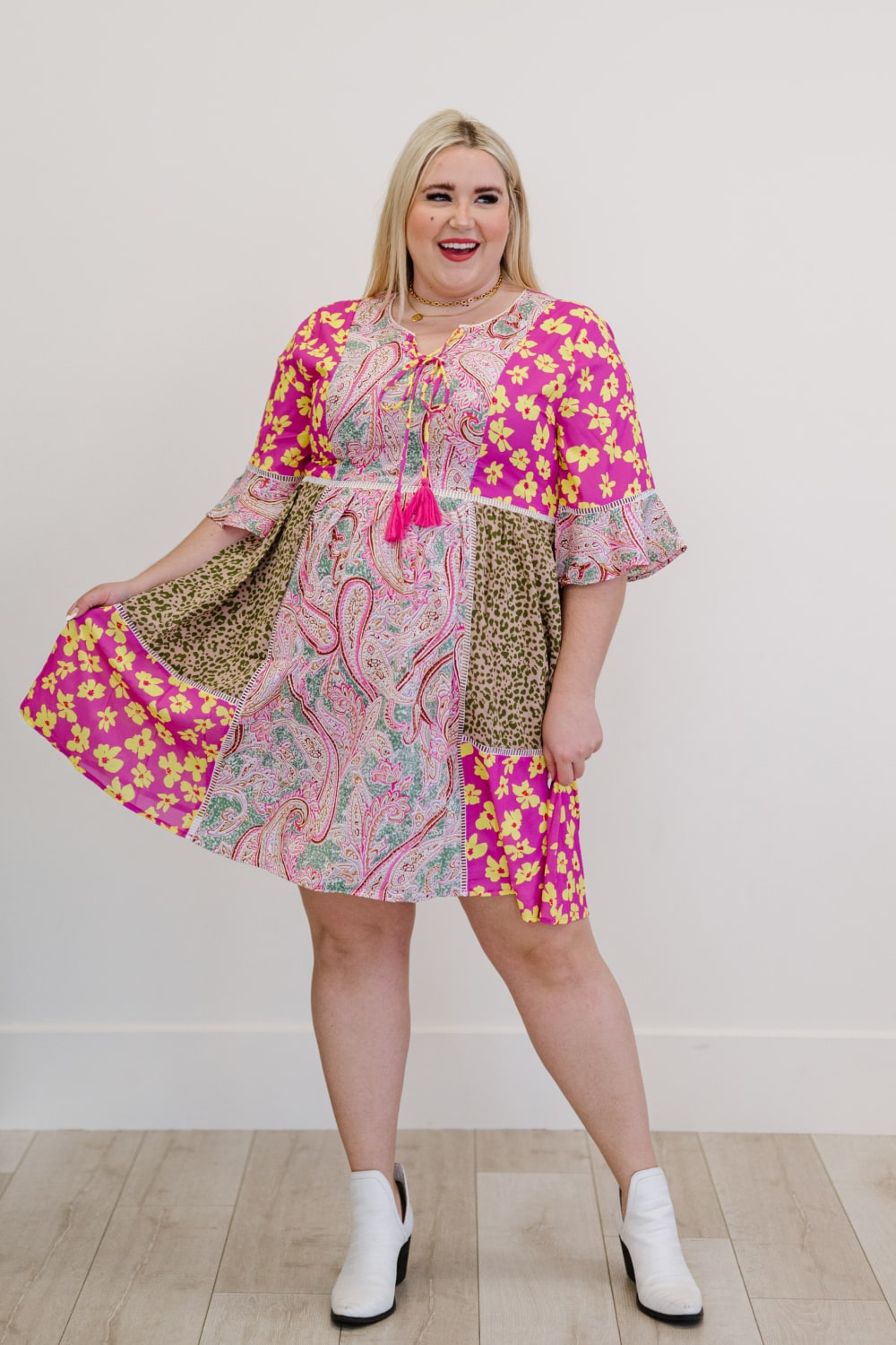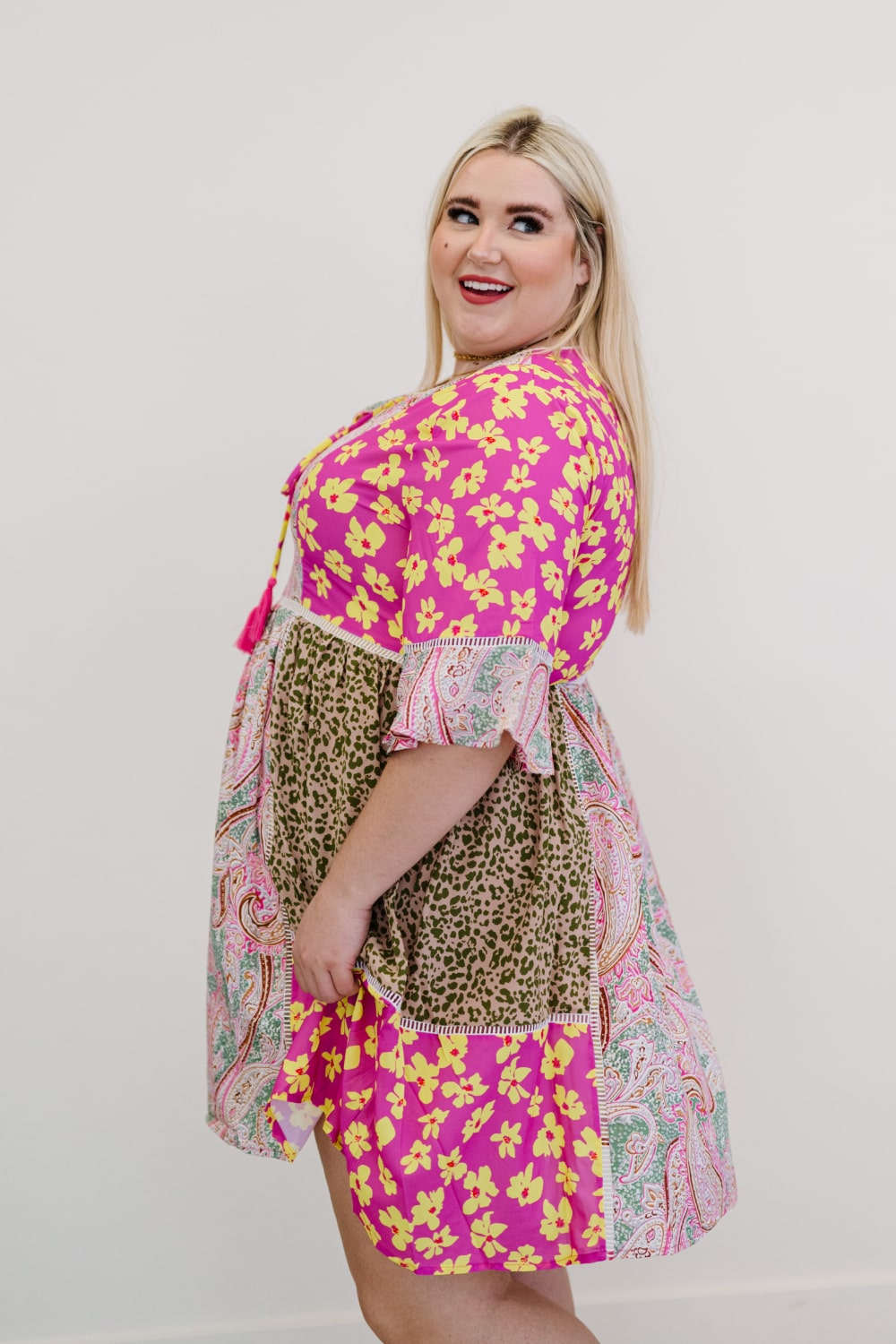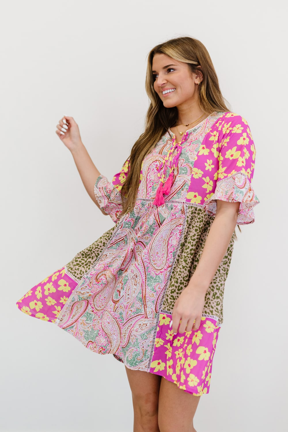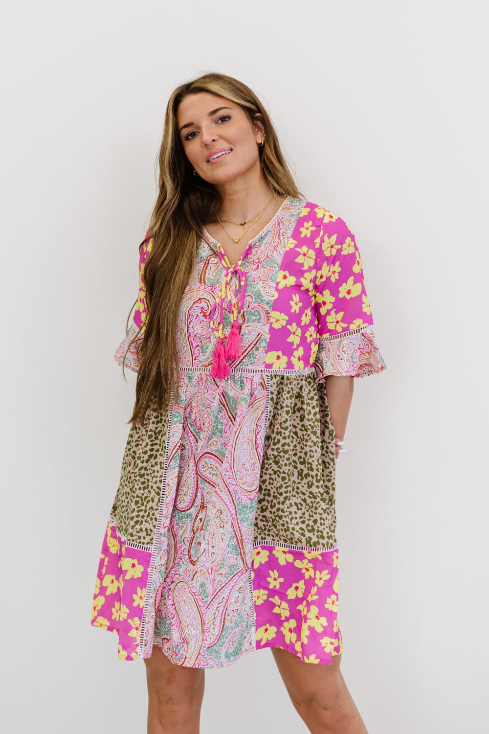 Floral, paisley, and animal print all in one dress? It really doesn't get more fun than that! The dress is super flowy and hits just above the knee. It has cage trim details on the waist and down the front which are not lined. To finish it off, the dress also has a super cute tassel tie and half-length flounce sleeves.