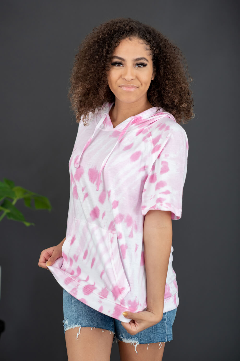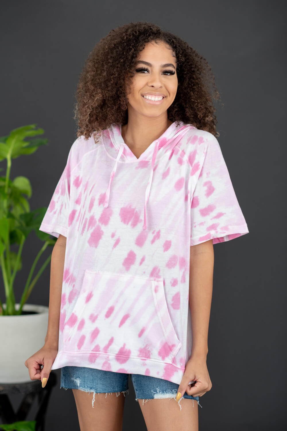 Sew In Love Watching Clouds Tie-Dye Short-Sleeved Hoodie in Neon Pink