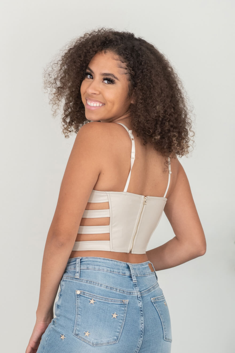 SHOPIRISBASIC Ready to Go Faux Leather Strappy Bustier Crop Top in Oyster