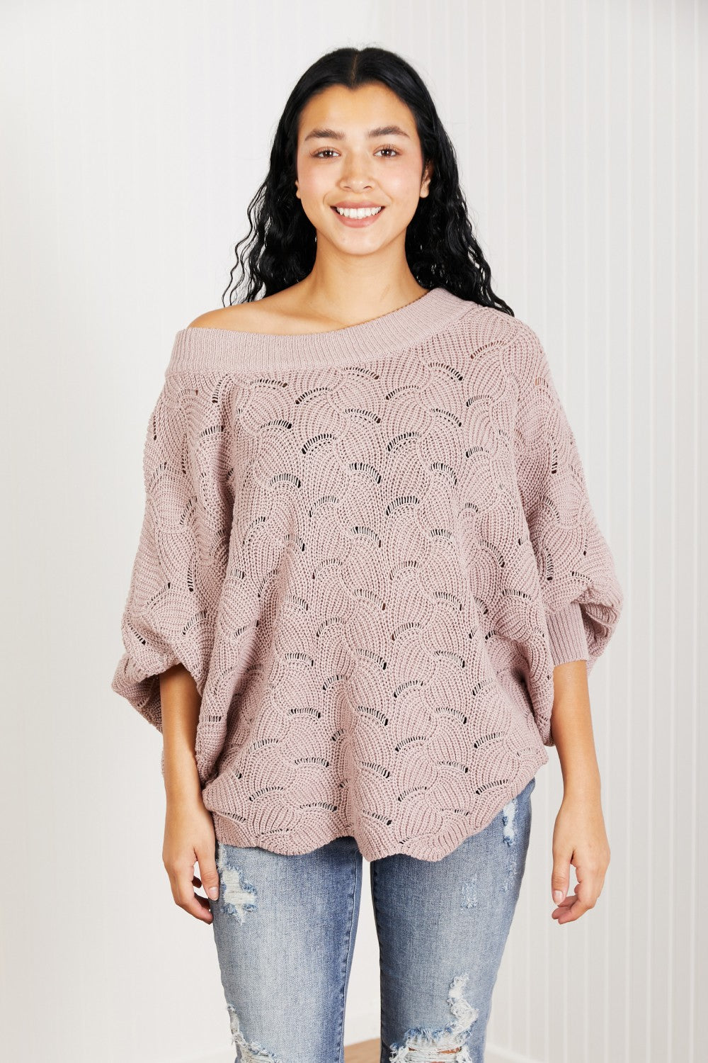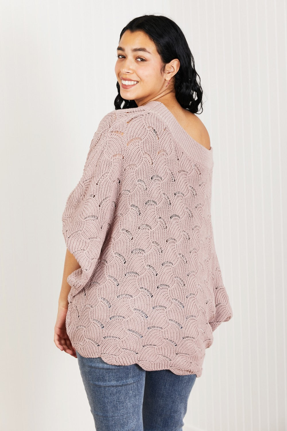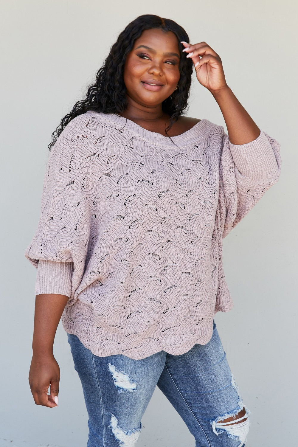 This scalloped openwork sweater features dolman sleeves and a scalloped hem. In a beautiful coloring, this sweater is a must-have.