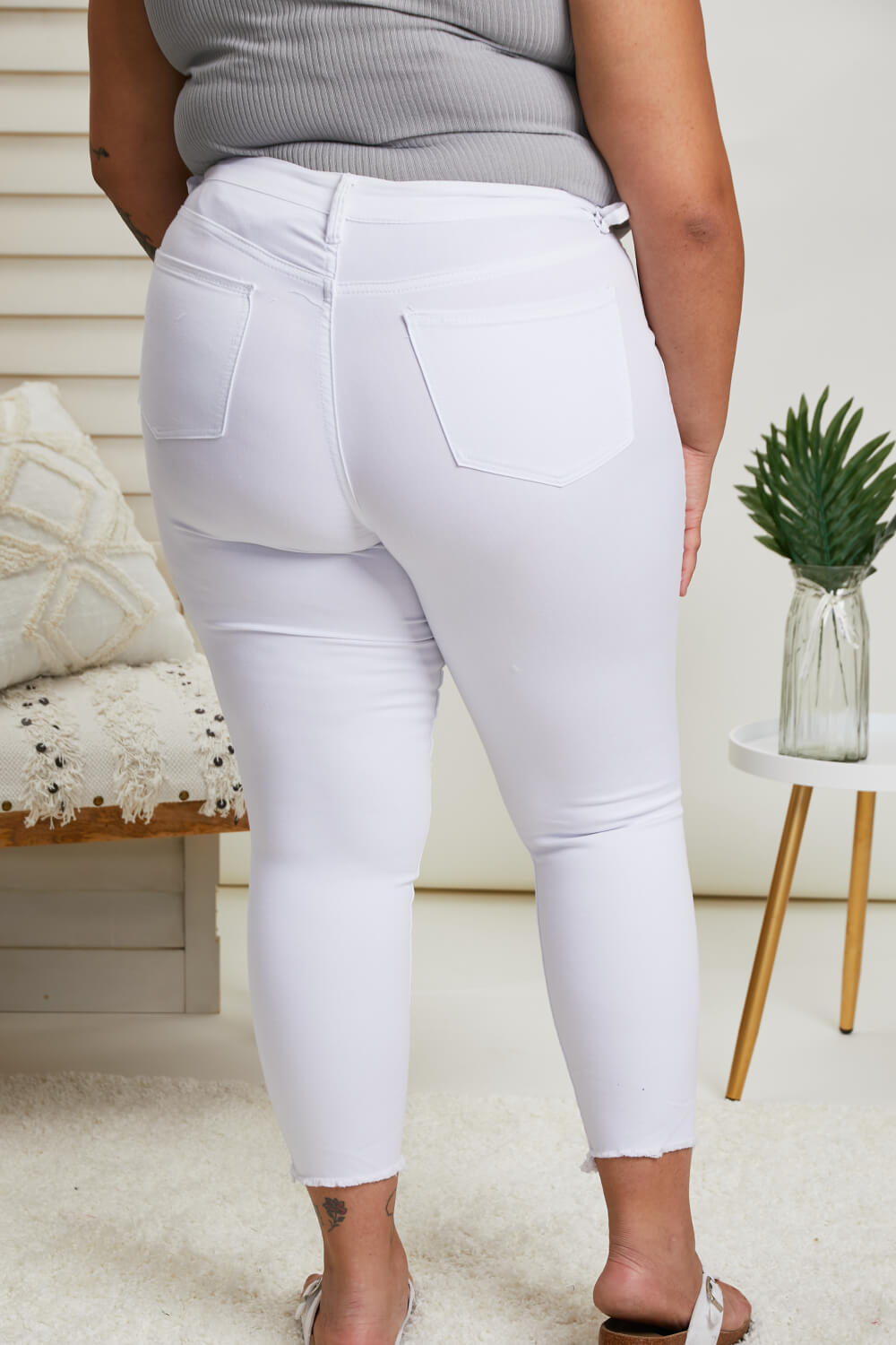 White and bright, these skinny jeans have an exposed button fly for a stylish detail, slight give for comfort, and a shark-bite fray on the hem for edge.