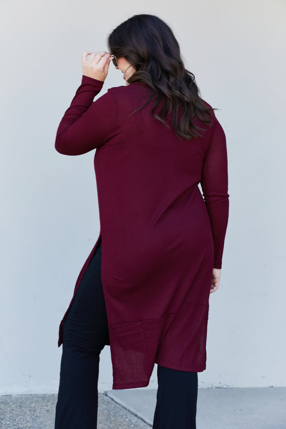 Zenana Autumn Aura Full Size Ribbed Longline Cardigan in Dark Burgundy